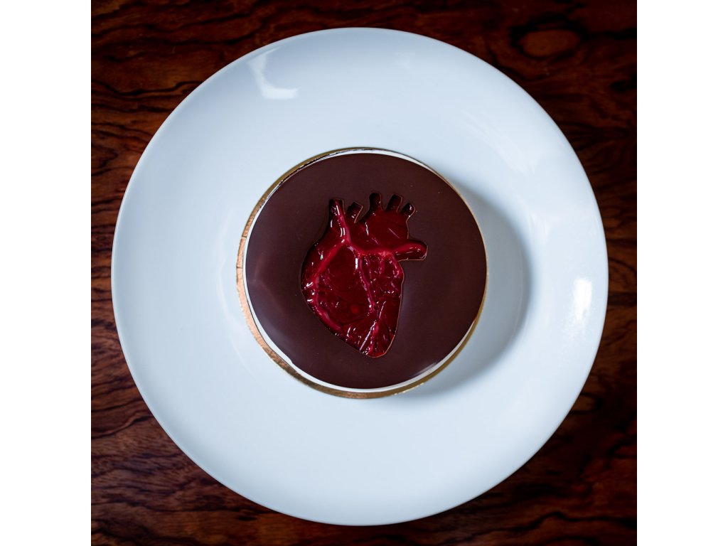 Valentýnský dort Srdce ze 70% čokolády, mexické vanilky a malin.